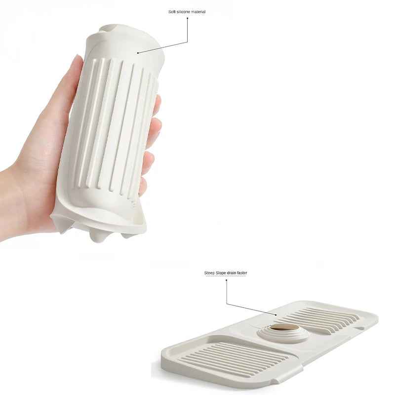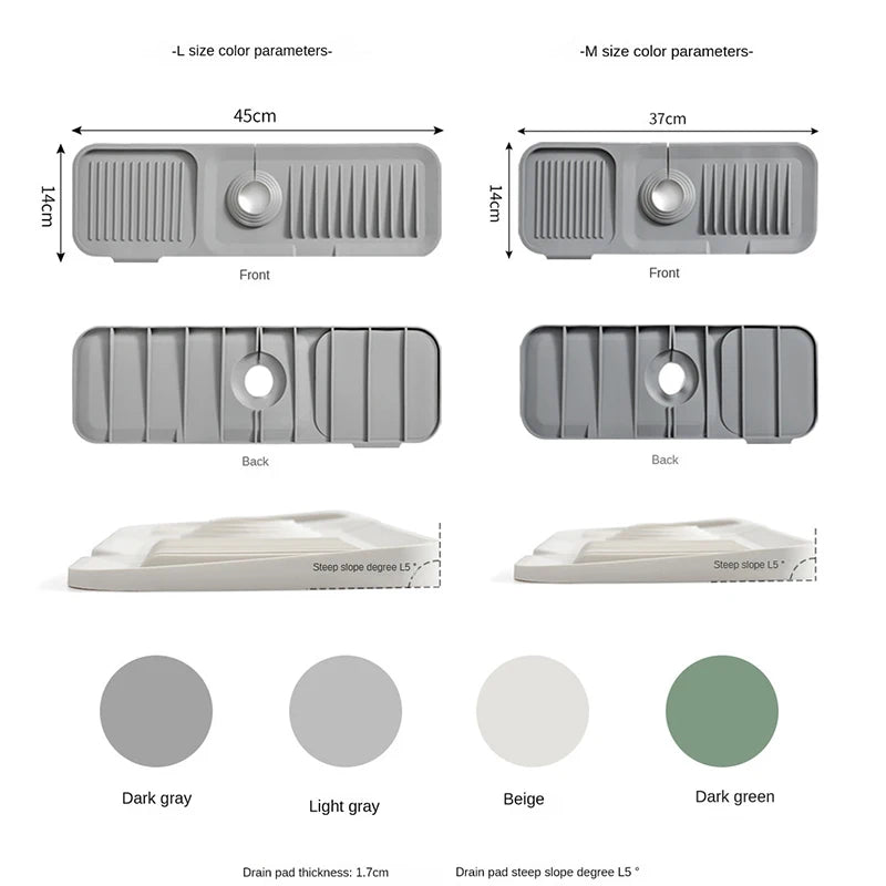 An ultimate silicone sink guard with an upgraded 5° self-draining slope design that catches all gross backsplashes and water drips. Allowing it to effectively keep your sink counter neat and dry as it rapidly clears the collected splatters out straight to the sink.